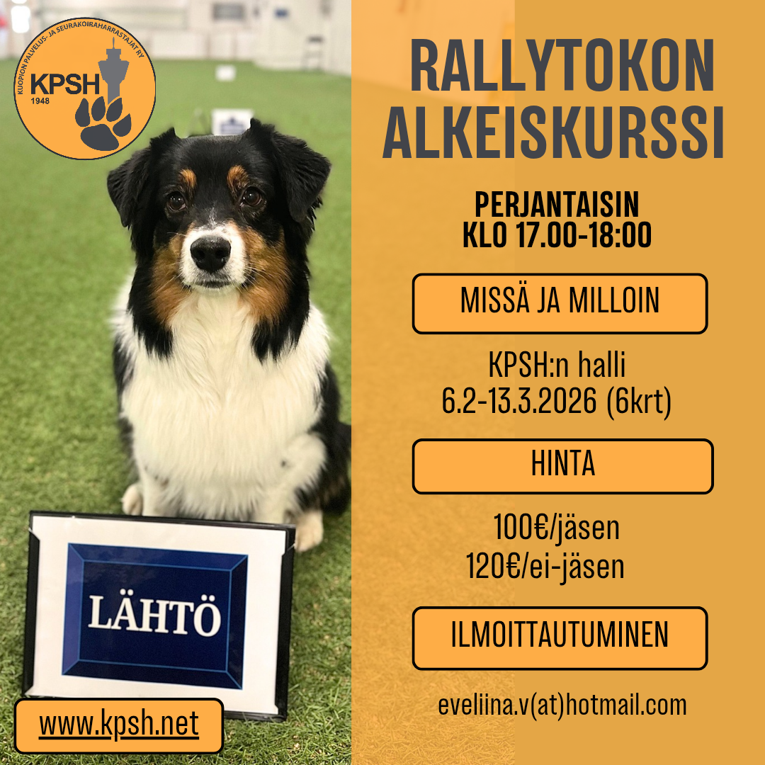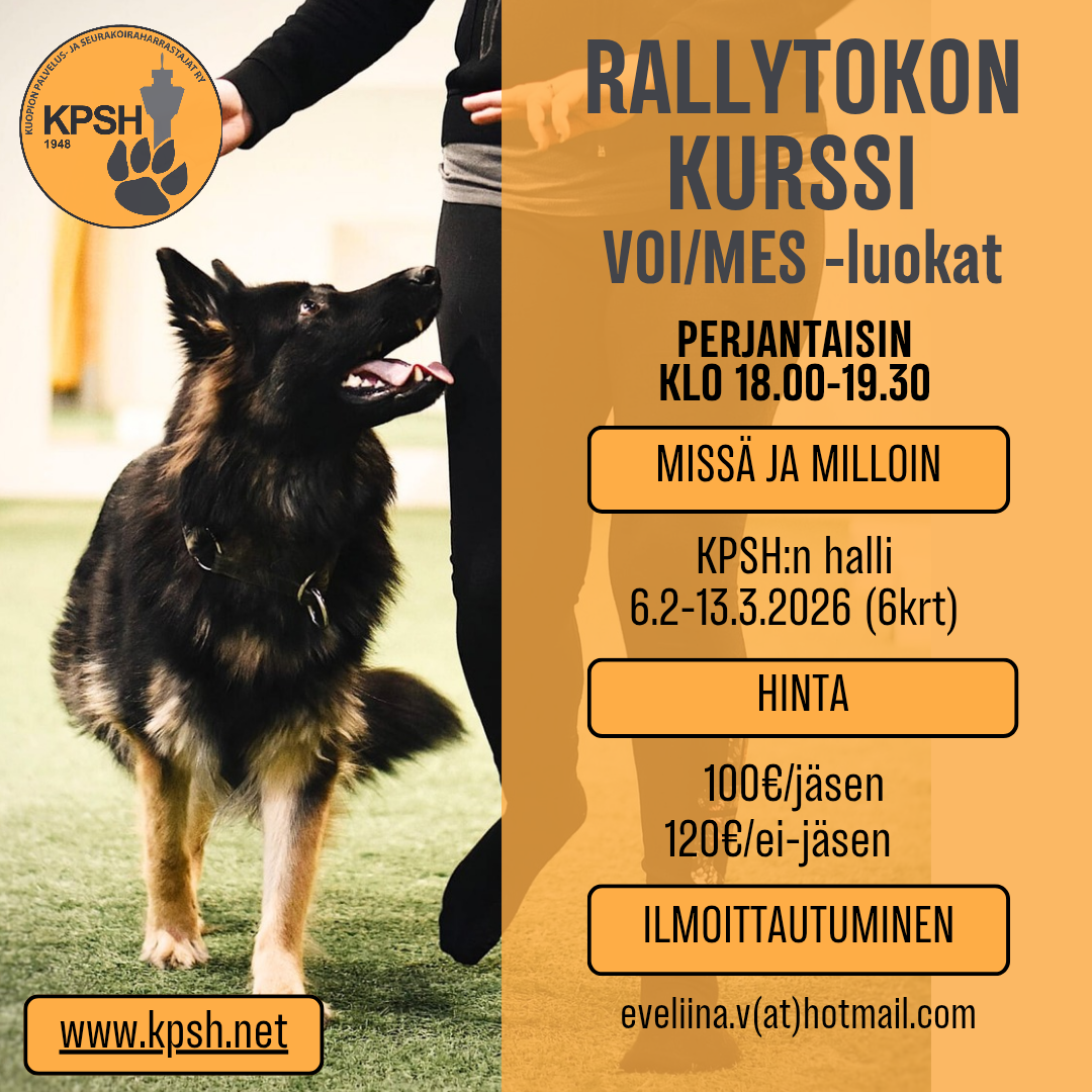 Kurssi sopii rallyn alempien luokkien perustaidot omaavalle, polkaisuna kohti VOI-MES luokkaa tai jo näissä luokissa kilpailevalle koirakolle. Kouluttajina Piia Pietikäinen ja Eveliina Väätäinen