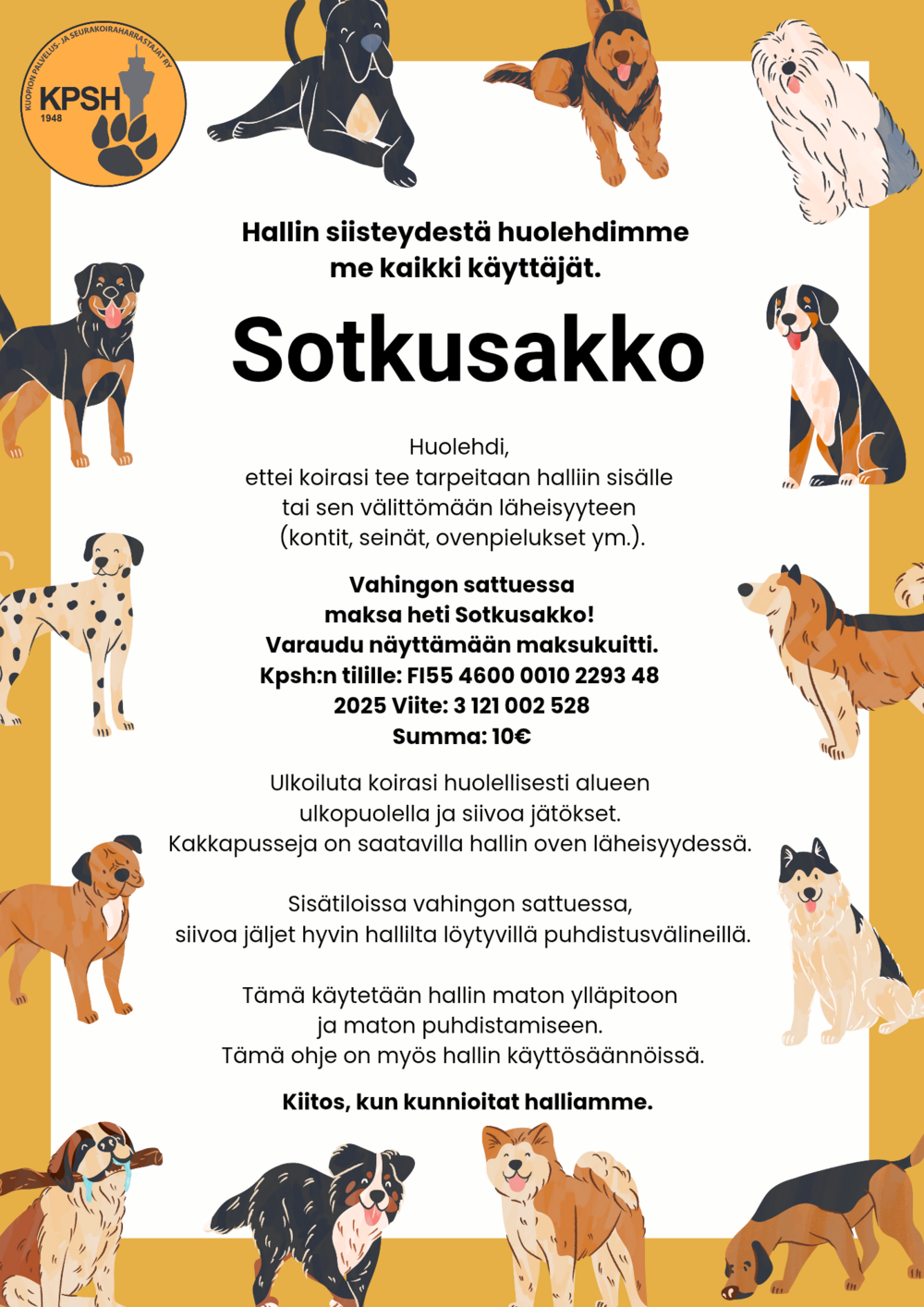 Ulkoiluta koirasi huolellisesti alueen aitojen ulkopuolella, ja siivoa jätökset. Kakkapusseja on saatavilla hallin oven läheisyydessä. Hallissa ja sen välittömässä läheisyydessä (kontit, seinät, ovenpielukset ym.) on käytössä SOTKUSAKKO! Ethän siis anna koirasi virtsata alueen kontteihin tai muuhunkaan alueella sijaitsevaan omaisuuteen! Sotkun sattuessa siivoa se välittömästi ja maksa sotkusakko.