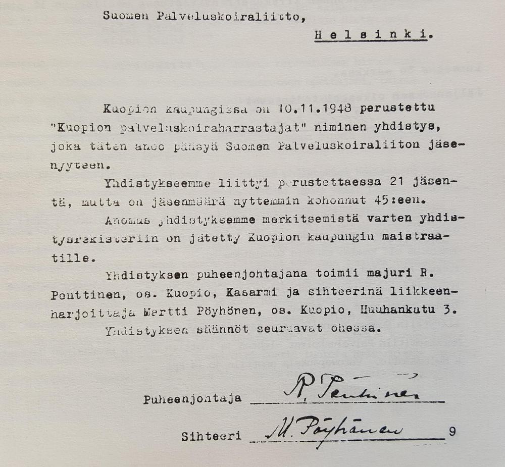 Yhdistyksen perustamiskirja sääntöineen allekirjoitettiin Kuopiossa marraskuun 10. päivänä 1948 ja se merkittiin yhdistysrekisteriin 2. päivänä maaliskuuta 1950. Yhdistyksen ensimmäinen puheenjohtaja oli vuosina 1948-1950 majuri Reino Penttinen. Perustettaessa yhdistyksen nimi oli Kuopion Palveluskoiraharrastajat.